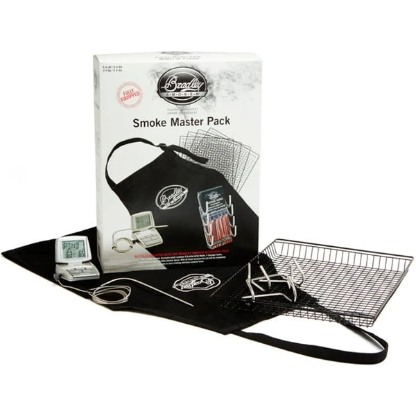 Das Smoke Master Zubehör Paket von Bradley beinhaltet das wichtigste Zubehör für den Bradley Smoker. Die vier Wursthaken aus verchromtem Stahl eignen sich zum Aufhängen von Fisch, Ribs, Würsten oder Schinken. Auf den vier Antihaft-Dörr-Rosten kann kleineres Räuchergut untergebracht werden, das bei den serienmäßigen Räucherrosten durch die Maschen fallen würde. Im Set ist außerdem ein digitales Grillthermometer mit eingespeicherten Kerntemperaturen der häufigsten Fleischsorten und Gargrade enthalten. Bei Erreichen der gewünschten Temperatur schlägt das Thermometer Alarm. Die Bradley Schürze schützt die Kleidung vor evtl. spritzendem Fett.Art.-Nr.: 1600909