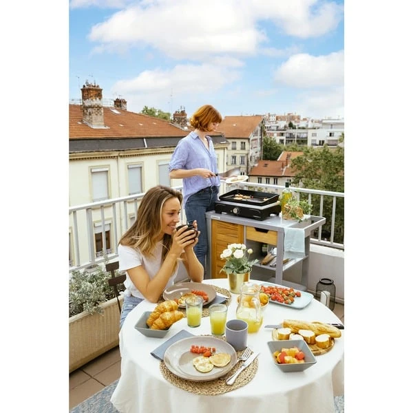 Es wird elektrisch! Plancha auspacken, Kabel einstecken und los geht’s mit dem GrillspaĂź! Die Plancha Electric 1 XD von Campingaz ist die ideale Lösung fĂĽr das urbane Grillen. Ohne sperrige Gasflasche kann man mit ihr auf dem Balkon oder einer kleinen Terrasse leckere Mahlzeiten grillen. Die emaillierte gusseiserne Grillplatte sorgt fĂĽr ein tolles GrillvergnĂĽgen und ist leicht in der Reinigung, sodass mehr Zeit fĂĽr Familie und Freunde bleibt. Dank der voreingestellten Temperaturauswahl war es noch nie so einfach, fĂĽr jedes Grillgut die richtige Gartemperatur zu erreichen und beizubehalten. Die Vielseitigkeit der neuen Plancha Electric 1 XD erlaubt es, egal wo und bei welchem Wetter zu grillen, im Garten, auf dem Campingplatz oder daheim, sogar drinnen in der KĂĽche. Die Plancha Electric verfĂĽgt ĂĽber einen spĂĽlmaschinenfesten, herausnehmbaren Fettauffangbecher, integrierte Griffe zum einfachen Tragen und SilikonfĂĽĂźe fĂĽr einen rutschfesten Stand. Die mitgelieferte Abdeckhaube schĂĽtzt die Plancha drauĂźen vor dem Wetter.Art.-Nr.: 100024615