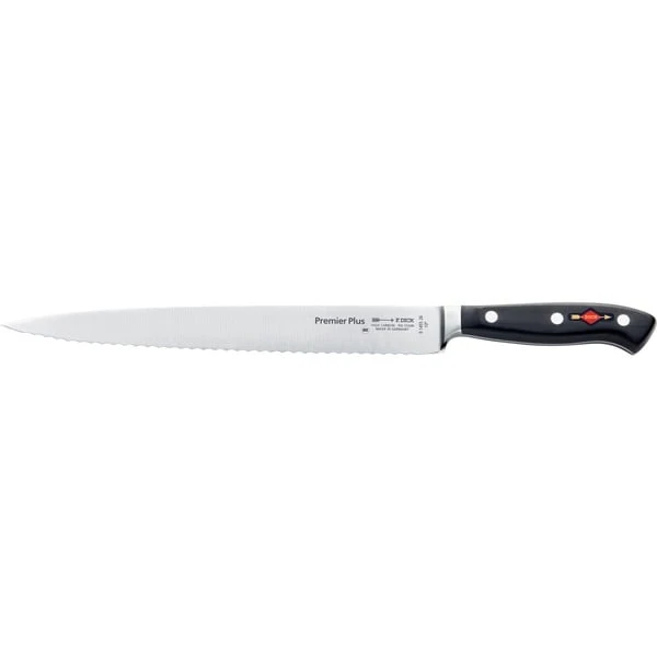 Die glatte Schneide und die dünne Klinge des Premier Plus Tranchiermessers 81455260 schneidet problemlos rohes Fleisch, Braten, Roastbeef oder Schinken in perfekte, dünne Scheiben und reduziert das Auslaufen von wertvollem Bratensaft. Der gezackte Wellenschliff schneidet dabei auch Krusten, z.B. beim Braten, einfach und schnell. Auch bei Obst und Gemüse mit fester Schale ermöglicht der Wellenschliff ein müheloses Schneiden. Professionelle Köche setzen seit Jahrzehnten auf die Messer der Serie Premier Plus von DICK. Die atemberaubende Schärfe, die perfekte Balance und das klassisch elegante edle Design überzeugen Küchenchefs auf der ganzen Welt. Besonders beim täglichen, langen Arbeiten mit dem Messer sind die Griffform ohne störende Kanten und die ergonomische Form von großer Bedeutung. Mit Liebe zum Detail werden die Messergriffe der Serie Premier Plus in feinster Handarbeit aufwändig abgerundet und liegen daher sehr angenehm in der Hand. Jedem Messergriff wird von erfahrenen Profis mit viel Sorgfalt der letzte Schliff verliehen. Besonders großer Wert auf die einwandfreie, erstklassige Schärfe der Messer gelegt. Die Klinge ist aus der hochwertigen Legierung X50CrMoV15 gefertigt, sie steht für lange Schnitthaltigkeit, Verschleißfestigkeit und höchste Endschärfe. Selbstverständlich sind die Premier Plus Messer absolut hygienisch. Durch das besondere Herstellungsverfahren werden die Griffe spaltenfrei mit der Klinge verbunden, so dass keinerlei Speisereste oder Flüssigkeiten eindringen können.Art.-Nr.: 1608916