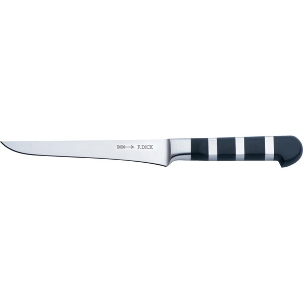 Im Jahr 1905 hat Friedr. Dick eine Kochmesserserie mit massiven Zwingen entwickelt, diese ersetzten die bisher üblichen Nieten. Seit damals besticht die Kochmesser-Serie 1905 durch ihre außergewöhnliche Optik. Die ebenmäßigen Stahlringe werden mit einer einzigartigen Technik mit dem Kunststoff untrennbar verbunden. Die Klinge ist aus dem speziellen Edelstahl XCrMoVMn, einem der hochwertigsten deutschen Stähle gefertigt, und der letzte Schliff wird wie schon immer Stück für Stück per Hand angebracht. Das Serie 1905 Ausbeinmesser 81945152 dient zum Herauslösen von Knochen und zum Entfernen von Fett und Sehnen. Mit seiner flexiblen Klinge passt es sich ideal an das Schneidgut an, entfernt nicht zu viel und nicht zu wenig. In Anerkennung der bereits 1905 gefertigten Qualität hat Friedr. Dick die originale Kennzeichnung mit der Marke „F. Dick“ gewählt. Dieses traditionelle Qualitätszeichen wird in Handarbeit geprägt. Mit der Serie 1905 verbinden sich traditionelles Design und moderne Technologie. Die außergewöhnliche Optik der 1905 Messer verbindet sich selbstverständlich mit den heutigen hohen Hygieneansprüchen.Art.-Nr.: 1608359