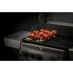 Die hochwertige Gusseisen-Grillplatte 56426 von Napoleon ist mit einer glatten Seite und einer geriffelten Seite ausgestattet. Die porzellanemaillierte Grillplatte eignet sich als Plancha und zum Grillen von kleinteiligem Grillgut, Meeresfrüchten, Spiegelei, Burgern und allem, was sonst durch den Grillrost zu rutschen droht. Man kann damit Zwiebeln karamellisieren, Speck anbraten, perfekte Kartoffeln zubereiten und noch viel mehr. Die große Oberfläche von ca. 30 x 45cm eignet sich hervorragend für das Anbraten von Zwiebeln und Champignons, die gut als Beilage zum Hauptgericht passen, oder für ein köstliches Frühstück für ein Essen im Freien. Das schwarze Gusseisen wird mit jedem Gebrauch nur noch besser. Die kleinen Löcher sorgen dafür, dass Fett abfließen kann, so wird der Bacon schön knusprig, die Würstchen herzhaft und lecker. Man kann mit dieser Wendeplatte die Grillroste ersetzen, oder man setzt die Platte direkt auf die Grillroste. Die Oberfläche ermöglicht eine leichte und schnelle Reinigung. Die wendbare Gusseisen-Grillplatte passt für die Grills der Serien Freestyle / Rogue 425(-1), 525-1, 625-1.Art.-Nr.: 1680365