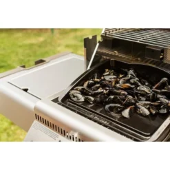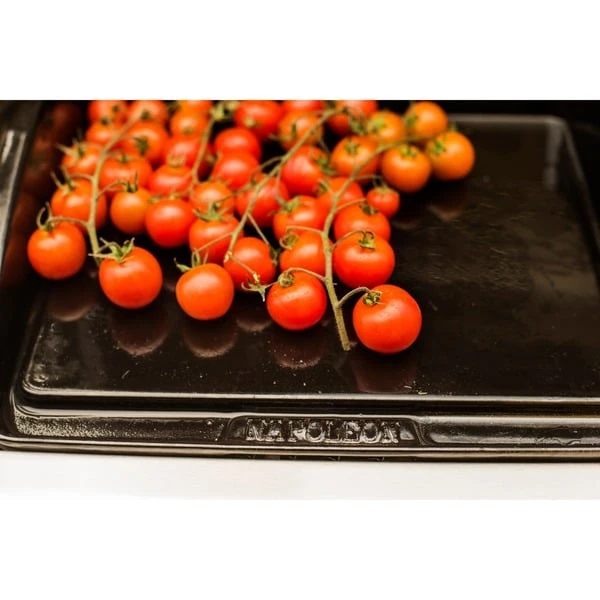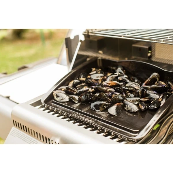 Die porzellanemaillierte Gusseisen-Plancha 56090 von Napoleon eignet sich zum Grillen bei hoher Temperatur. Die 38 x 21cm große Plancha mit extra hohem Rand ist optimal für empfindliche Lebensmittel. Auf der anti-haftenden Oberfläche lassen sich Fisch, Meeresfrüchte, Burgerpatties, Speck und kleinteiliges Gemüse lecker grillen, wobei Fette und Säfte dank der schrägen Oberfläche abgeleitet werden. So gelingen die Gerichte besonders kross und garen nicht im eigenen Saft.Art.-Nr.: 1404557