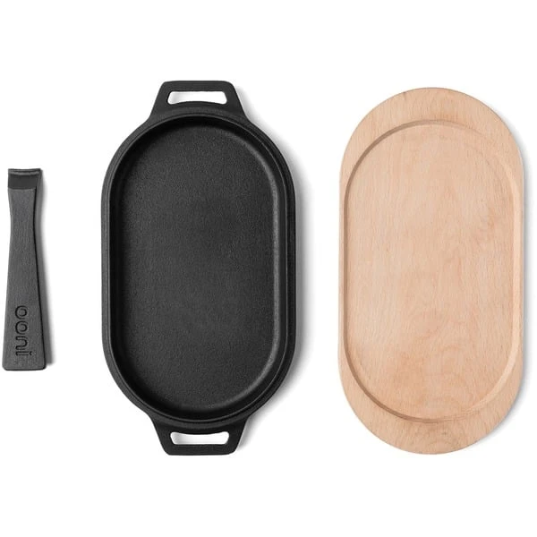 Die gusseiserne Sizzler-Pfanne von Ooni hat die perfekte Größe zur Verwendung mit allen Ooni-Pizzaöfen. Die vielseitige Grillpfanne mit glatter Grillfläche eignet sich für Bacon oder Spiegeleier, Fisch, Meeresfrüchte oder Gemüse. Das robuste Gusseisen nimmt die Hitze schnell auf und verteilt sie gleichmäßig auf die gesamte Fläche. Mit dem speziell entworfenen abnehmbaren Griff lässt sich die Ooni-Sizzler-Pfanne sicher in den Ofen hineinschieben und wieder aus dem Ofen herausholen. Auf dem mitgelieferten Sockel aus FSC-zertifiziertem Holz kann man das fertige Gericht dann direkt am Tisch servieren. Die FSC Zertifizierung besagt, dass zur Herstellung ausschließlich Hölzer aus nachhaltiger Forstwirtschaft verwendet werden.Art.-Nr.: 1642452