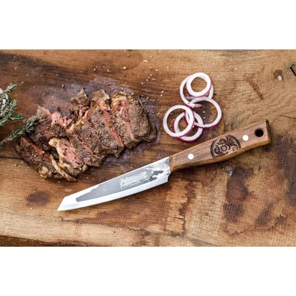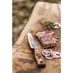 Das Petromax Allzweckmesser apknife14 ist ein in Handarbeit in Solingen gefertigtes, vielseitiges Messer zum Schneiden von Grillgut und Zutaten. Hochwertiger Stahl und ein robuster Griff aus Walnussholz sorgen dafür, dass das rustikale Messer im Petromax-Design mit Schriftzug und Drachenlogo ein verlässliches Werkzeug ist. Mit einer Materialstärke von 2mm kann man mühelos Kräuter hacken, Tomaten teilen oder Zwiebeln schneiden. Durchgehender rostfreier Stahl und der fugenlos vernietete Griff ermöglichen eine sichere Handhabung und Hygiene. Das Petromax Allzweckmesserist ein individuelles Messer, das mit starkem Design, präziser Schärfe und perfekter Verarbeitung punktet. Die Oxidschicht und der herausragende Schliff in Handarbeit machen das Messer zu einem ganz persönlichen Werkzeug, jedes Stück ein Unikat. Die Klinge des Petromax Allzweckmessers hat eine Länge von 14cm und wurde per Hand in Solingen gehärtet und geschliffen. Diese Eigenschaften machen das Messer besonders scharf, langlebig und widerstandsfähig. So wird es zum unverzichtbaren Utensil für jedes Kocherlebnis im Freien.Art.-Nr.: 1908405