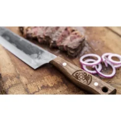 Das Petromax Kochmesser chknife17 ist ein in Handarbeit in Solingen gefertigtes, vielseitiges Messer zum Schneiden von Gemüse, Fisch und Fleisch. Hochwertiger Stahl und ein robuster Griff aus Walnussholz sorgen dafür, dass das rustikale Messer im Petromax-Design mit Schriftzug und Drachenlogo ein verlässliches Werkzeug ist. Dank einer Materialstärke von 3mm kann man Gemüse präzise hacken, Fisch filetieren und Fleisch einfach schneiden, um sie über dem lodernden Feuer zu braten. Für den aromatischen Geschmack kann man außerdem mit dem Kochmesser frische Kräuter wiegen. Durchgehender rostfreier Stahl und der fugenlos vernietete Griff ermöglichen eine sichere Handhabung und Hygiene. Das Petromax Kochmesser ist ein individuelles Messer, das mit starkem Design, präziser Schärfe und perfekter Verarbeitung punktet. Die Oxidschicht und der herausragende Schliff in Handarbeit machen das Kochmesser zu einem ganz persönlichen Werkzeug, jedes Stück ein Unikat. Die Klinge des Petromax Kochmessers hat eine Länge von 17cm und wurde per Hand in Solingen gehärtet und geschliffen. Diese Eigenschaften machen das Kochmesser besonders scharf, langlebig und widerstandsfähig. So wird es zum unverzichtbaren Utensil für jedes Kocherlebnis im Freien.Art.-Nr.: 1908401
