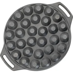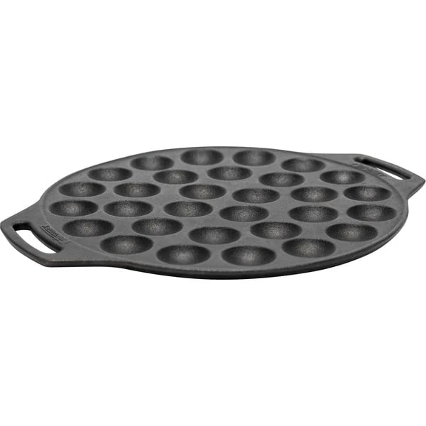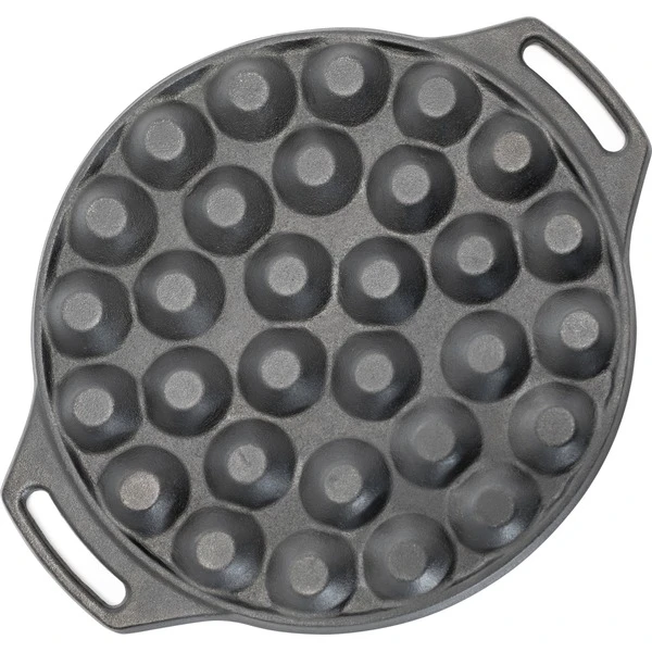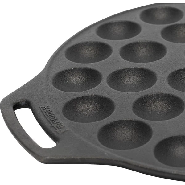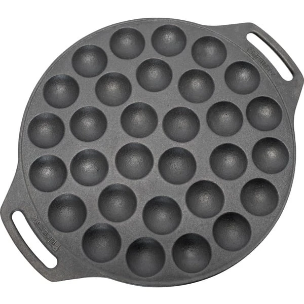 Die Petromax Poffertjespfanne bietet Abenteuergeschmack in mundgerechten Portionen. Die Poffertjespfanne zaubert ein außergewöhnliches Dessert am Lagerfeuer und begeistert besonders den Nachwuchs in der Runde. Egal ob mit offenem Feuer oder über der heißen Glut des Grills gekocht wird, die Poffertjespfanne versüßt in allen Lagen den lauen Sommerabend. Mit der Sonderform aus Gusseisen kann man 30 Stück der niederländischen Mini-Pfannkuchen gleichzeitig und in kürzester Zeit ausbacken. Die ausgezeichnete Wärmeleitfähigkeit der Poffertjespfanne aus Gusseisen sorgt dabei für ein gleichmäßiges Backergebnis. Dabei sorgen die beiden Henkel für einen sicheren Halt. Die Pfanne mit einem Durchmesser von 30cm passt übrigens optimal in den Petromax Atago und liegt am oberen Rand auf. Auch zu Hause muss man nicht auf den unverwechselbaren Geschmack verzichten, denn die Unterseiten der 30 Backmulden sind abgeflacht. Dadurch steht die Poffertjespfanne auf dem Backblech stabil und kann sowohl im Ofen als auch auf allen gängigen Herdarten genutzt werden.Art.-Nr.: 1618489