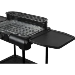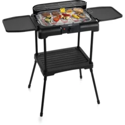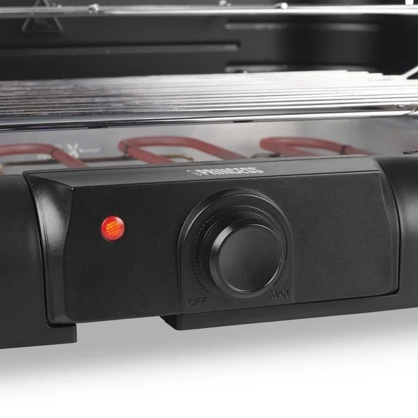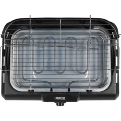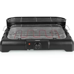 Der Elektrogrill 112250 von Princess ermöglicht ein schönes Barbecue im Garten mit der Familie oder mit Freunden. Mit einer Leistung von 2.200 Watt heizt er schnell auf und man kann innerhalb weniger Minuten Fleisch, Fisch oder Gemüse grillen. Die gesamte Flüssigkeit und das Fett tropfen durch den Grillrost in die Wasser-Auffangschale und werden gleich abgekühlt, sodass keinerlei Asche und Rauch aufsteigen können. Möchte man einmal nicht am Grill stehen, lässt sich der Grill 112250 als Tischmodell nutzen und man genießt gemeinsam ein leckeres Abendessen. Der Elektrogrill hat einen Rost von 40 x 24,5cm, so dass man verschiedene Fleisch-, Fisch- und Gemüsesorten gleichzeitig grillen kann. Auf dem oberen Grillrost kann ein größeres Stück Fleisch ruhen, damit es warm und saftig bleibt, während man das Gemüse auf dem unteren Rost blitzschnell grillt, damit alles gleichzeitig serviert werden kann. Dank der stufenlos einstellbaren Temperatur hat man eine einfache Kontrolle über den Grillvorgang und kann auch empfindlichere Produkte wie Fisch leichter zubereiten. Auch am Urlaubsort kann man die einfache Art des Grillens genießen. Dank des mitgelieferten Gestells kann der Grill stehend oder als Tischmodell verwendet werden. Der Grill ist mit einem Windschutz, einer Ablage im Untergestell und praktischen Seitentischen für das gesamte Grillzubehör ausgestattet. Außerdem ist der Grill mit den integrierten Griffen leicht zu bewegen. Der Elektrogrill 112250 lässt sich nach dem Essen sehr einfach für die Reinigung zerlegen.Art.-Nr.: 1833279