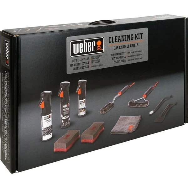 Mit dem kompletten Reinigungs-Set 18284 für emaillierte Gasgrills von Weber ist alles Notwendige zur Hand, um den Grill gründlich zu reinigen und ihn auf die nächste Grillsaison vorzubereiten. So bleibt der Grill immer in Topform. Das Set enthält eine dreiseitige Grillbürste und den Grillrost-Reiniger zum Reinigen des Grillrosts, zwei Schwämme mit einer groben Scheuerseite für Roste und Flavorizer Bars sowie einer weichen Seite für andere Oberflächen, einen Grillkammer-Schaber für eine effektive Reinigung des Inneren des Grills, eine Insektengitter-Bürste für eine einfache Reinigung aller Ecken des Grills und eine Grillbürste speziell für die einfache Reinigung der Brenner. Das Antihaft-Spray löst Lebensmittelreste vom Grillrost, der Emaille-Reiniger schützt Emaille-Teile und bringt sie zum Glänzen, das Mikrofasertuch eignet sich perfekt zum Abwischen und anschließenden Polieren des Grills.Art.-Nr.: 1810875